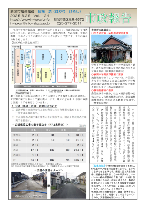 市政報告 VOL.242025年3月25日市政報告をお届けします。詳細をお読みいただくには、下のPDFファイルをダウンロードしてご覧ください。 保苅ひろし 市政報告 VOL.24 ご覧いただくにはPDFファイルの閲覧用ソフトが必要です。 ダウンロード(PDFファイル 1.4 MB)